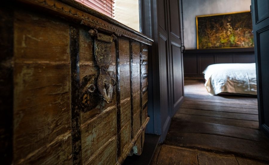 Der "Sherlock" -Raum: mit seinem Kuriositätenkabinett, seinem Badezimmer im Schlossturm und seinem atypischen Kupferinselbett.