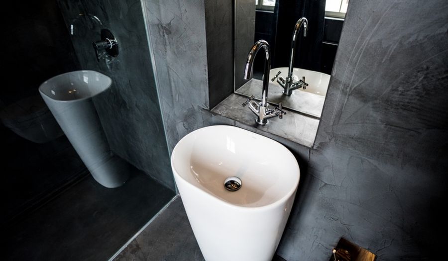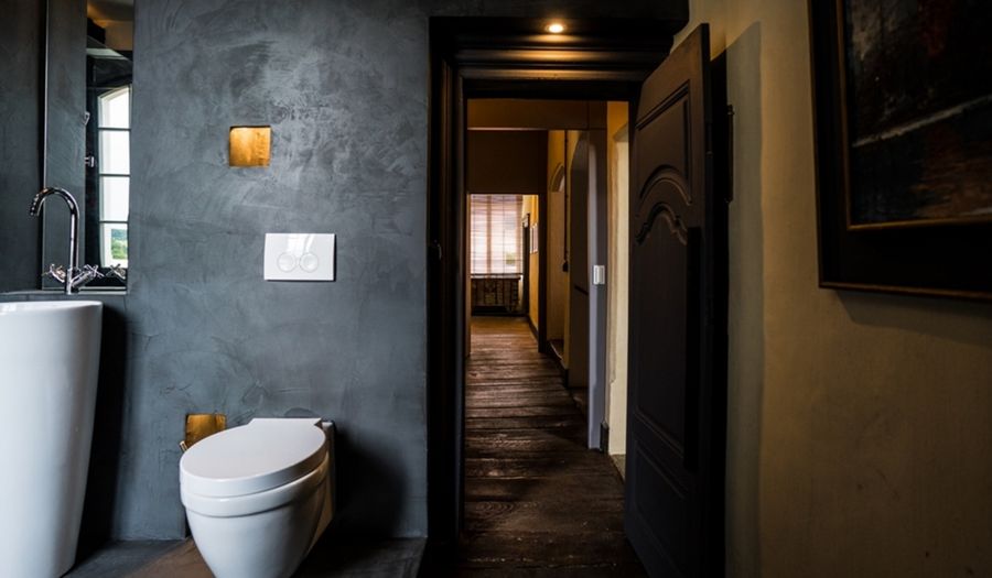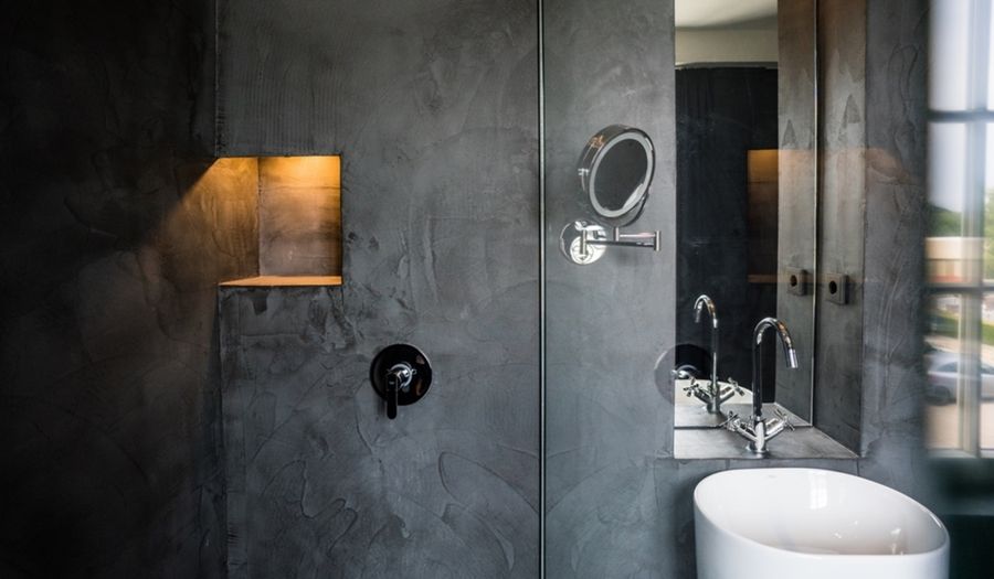 Der Badezimmerraum beeindruckt auch durch seine atypische Atmosphäre. Die Verwendung von schwarz gewachstem Beton erinnert an unterirdische Bergbauarbeiten. Das Material/Licht Konzept schafft eine unvergessliche Atmosphäre.