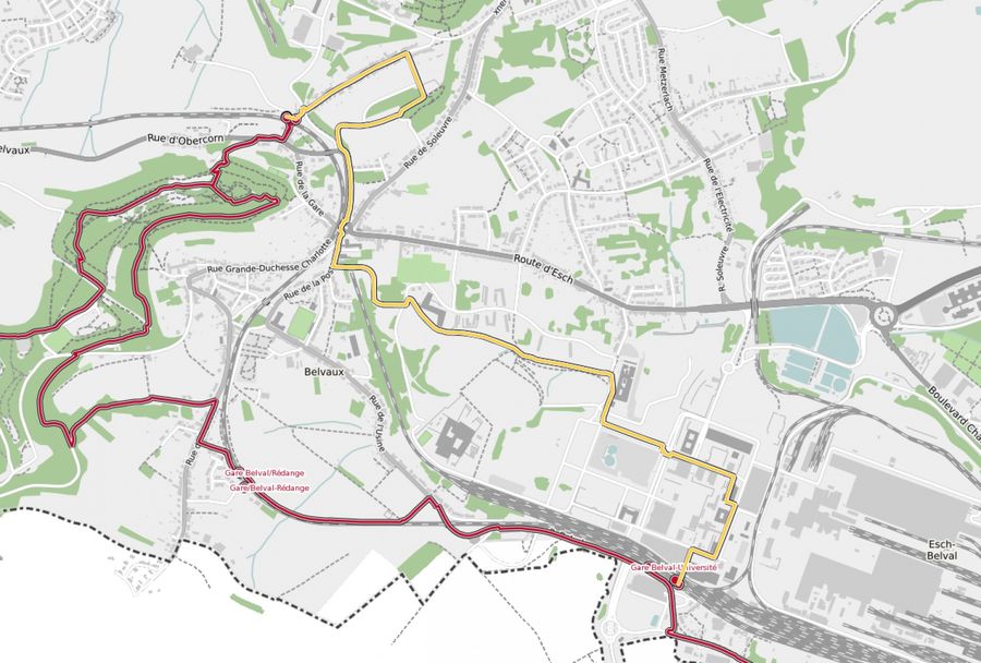 Verlängerungsmöglichkeiten: CFL-Wanderwege 24, Belvaux-Soleuvre – Belval-Université (4,2 km) oder 27, Belvaux-Soleuvre – Oberkorn (4,8 km).