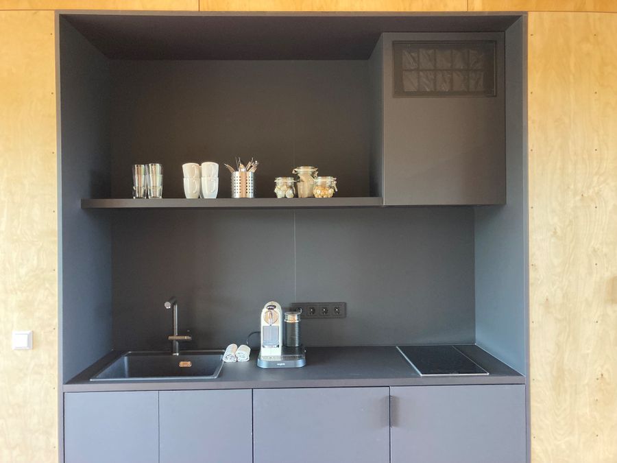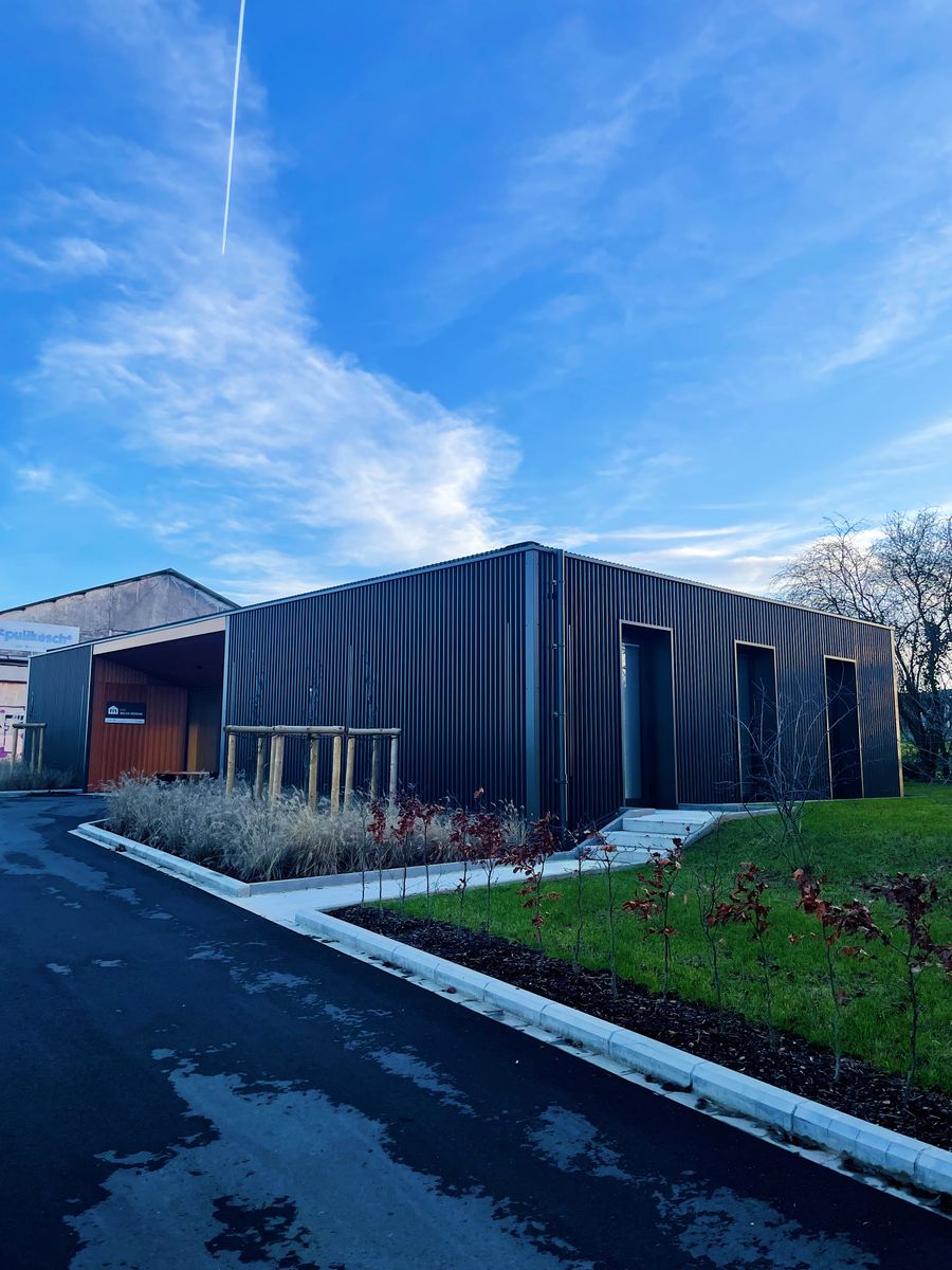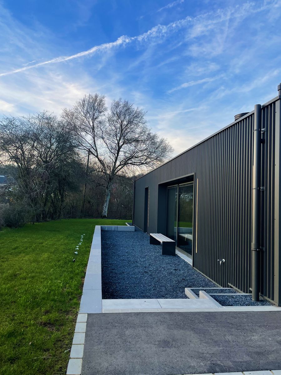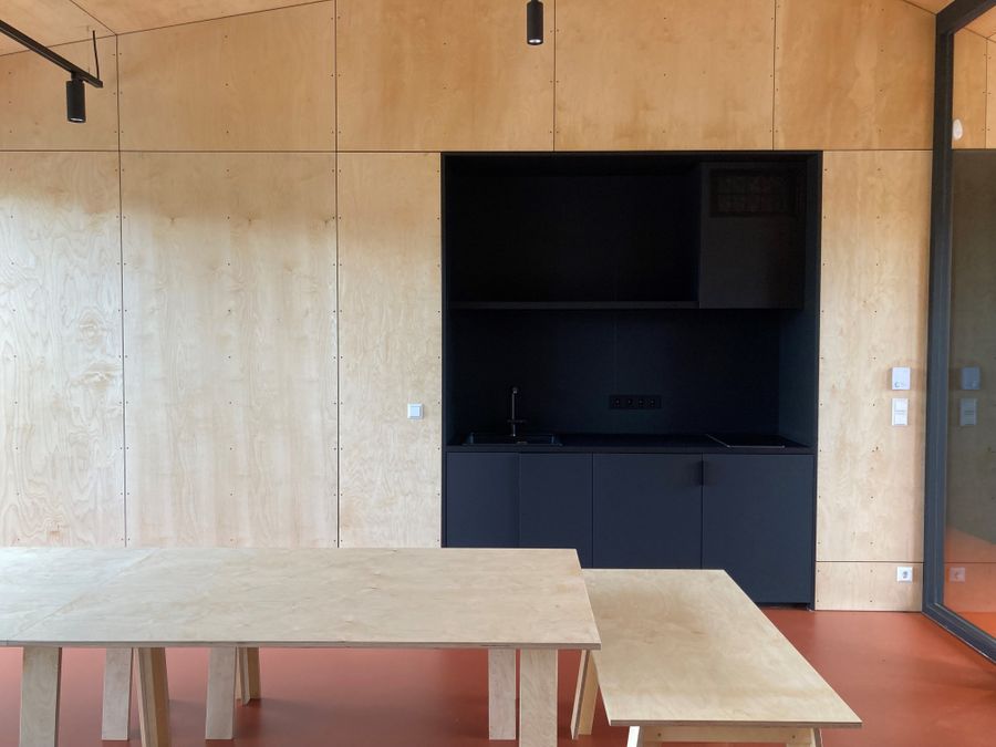 Sur la parcelle se trouvait une construction de bungalow des années 50 prévue qui a été démolie suite à son état délabré. Cependant, sa typologie a été revisitée, avec une interprétation contemporaine. La ligne de toit rappelle la halle industrielle qui se situe à proximité immédiate et sur la même propriété. Le résultat est une cabane de randonneur ultramoderne, qui vaut absolument la peine d'être visitée.