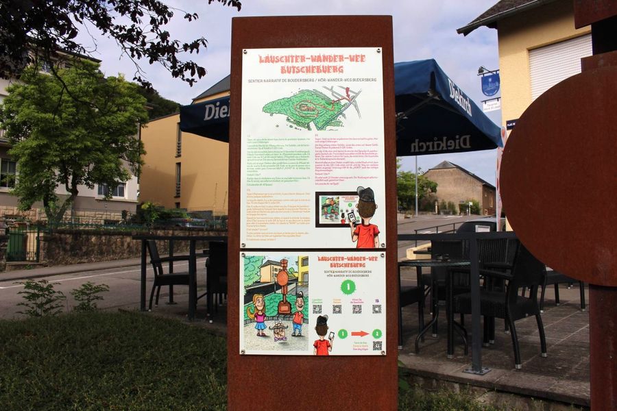 Le point de départ du parcours audio-pédestre est sur la place Gymnich dans le quartier résidentiel de Budersberg. La destination se trouve au Mont St. Jean. Le parcours passe par 10 stations, principalement à travers la forêt. À chaque station se trouve un panneau avec 5 codes QR différents. Vous pouvez choisir parmi quatre langues différentes : luxembourgeois, français, allemand ou langue des signes (avec l'aide du service d’accompagnement des malentendants SmH). Le promeneur peut écouter ou regarder l'histoire sur son smartphone. Le 5e code indique le chemin jusqu'à la station suivante.
