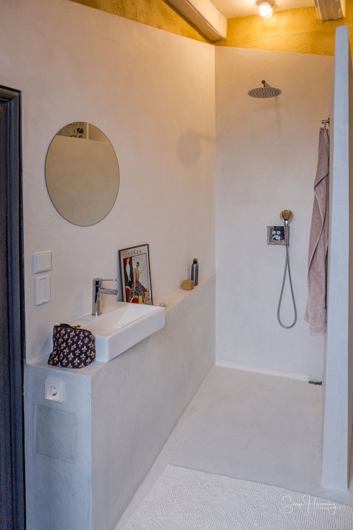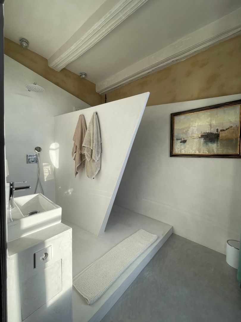 “Sea of Ice” bathroom with an “Italian” shower, sink and toilet