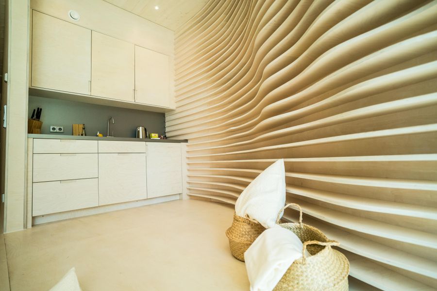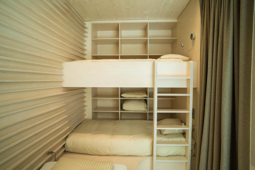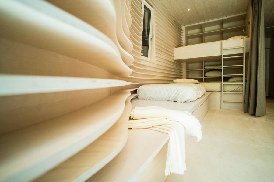 The steel front interacts with the water, but also allows a view of the cool water and the surroundings. Since the hiker's hut rests just above the water surface, the ecosystem that has built up under the water surface should not be unnecessarily disturbed. A large picture window allows a fascinating view on the water tower, but those who prefer privacy can relax behind the curtain in one of the available sleeping alcoves. A total of four beds are available.