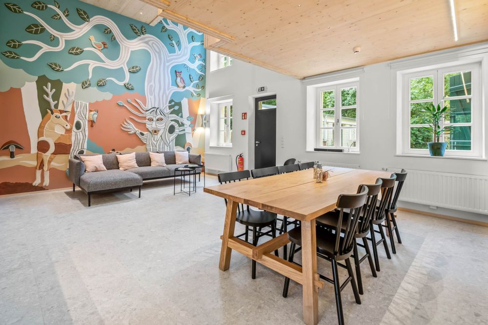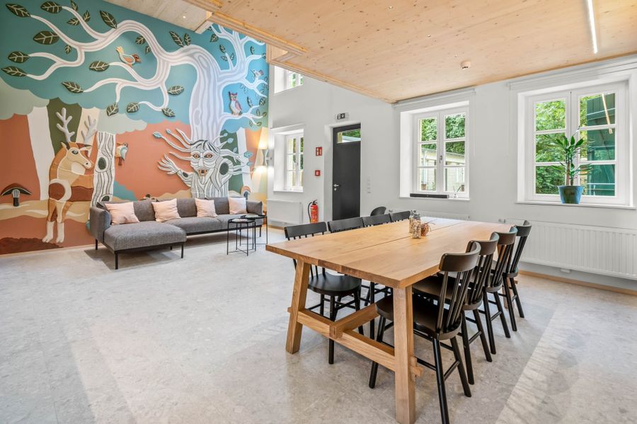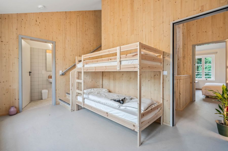 This "Kabaischen" created as part of the hiking trail is, like its 10 siblings, also a converted historical building. This former workers' house has been transformed into a two-storey "Kabaischen" by the architect Anouk Pesch; A large common room ensures more exchange between like-minded hikers and other guests. The interior is divided into three separate rooms; a single bed room ("Hekate") on the ground floor and a room for three ("Morgan Le Fay") and four guests ("Marie Laveau") on the first floor. All rooms have a direct view of one of two frescoes that were decorated as an art facility in the "Kabaischen". In addition, they all have their own bathroom. A shared kitchen completes the package. A total of eight beds are available.