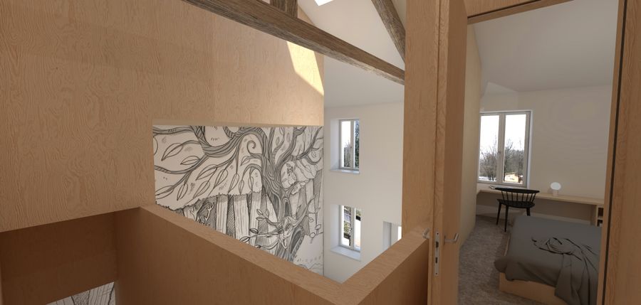 The new interior walls and ceilings consist of untreated solid wood elements. All suggested building materials are renewable raw materials, which can also be easily reused due to their processing and mechanical fastening.