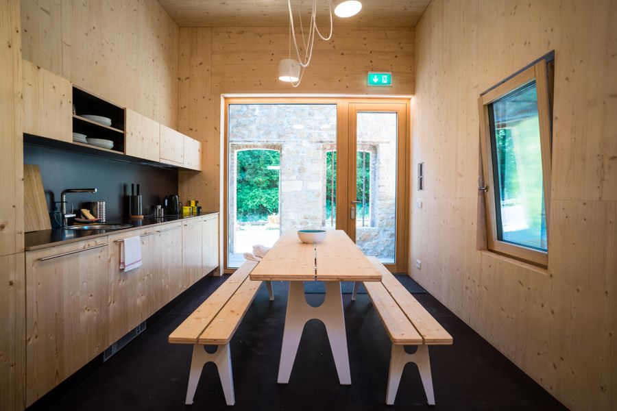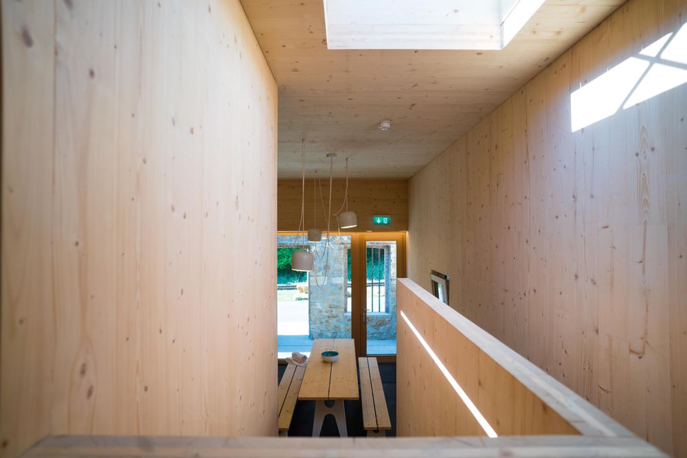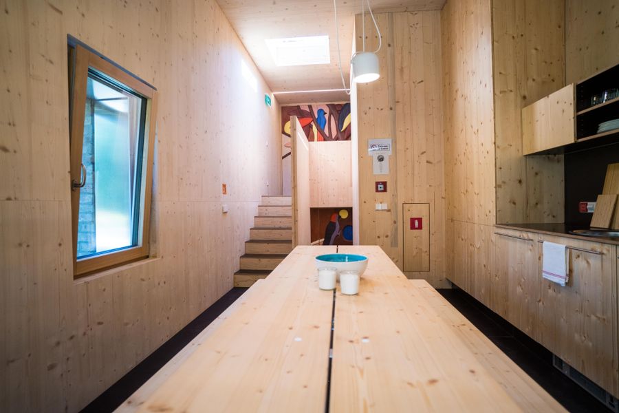 Divided into four small sleeping cabins with four twin beds over two floors, which all have a shared anteroom where you can relax or chat with other guests, "Haus Gonner" is a small miracle of room division. The upgrades haven't even increased the footprint of the building. On the contrary: the outer walls have been preserved, only the interior has changed, with the new living element being used as a whole. The concept was elaborated by HAS Heisbourg + Strotz Architectes.