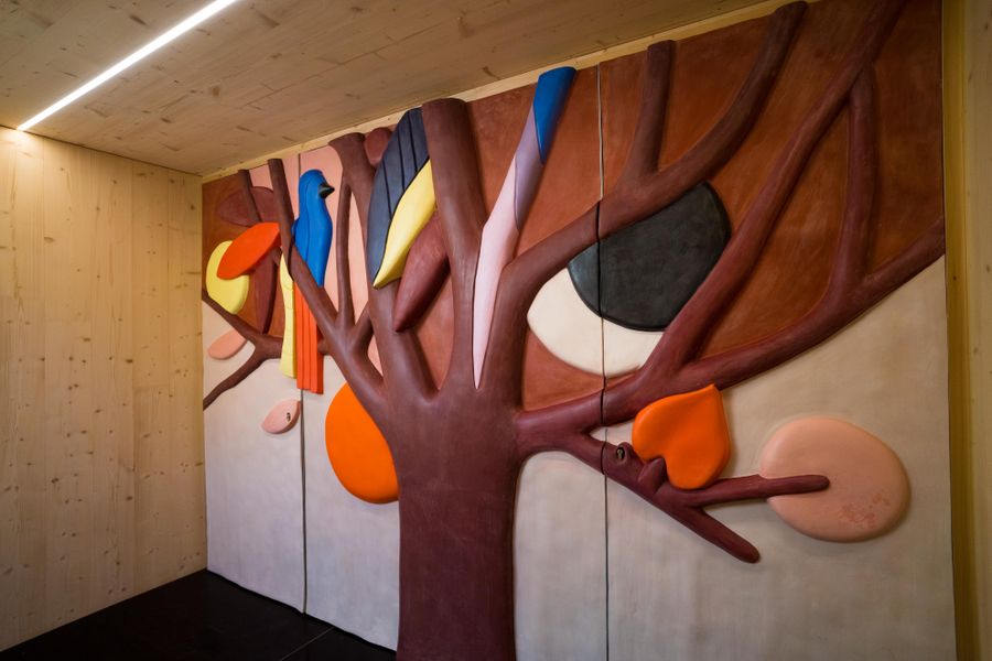 Natural materials and colours are also used in a ceramic artwork in the wall inside the Maison Gonner. Here too, the relationship between mankind and its natural habitat is brought into focus.